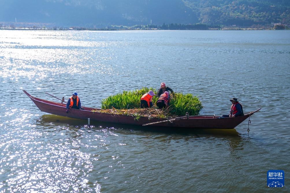 1月22日,工作人员对滇池里的生态浮岛进行植物管护。新华社记者 彭奕凯 摄