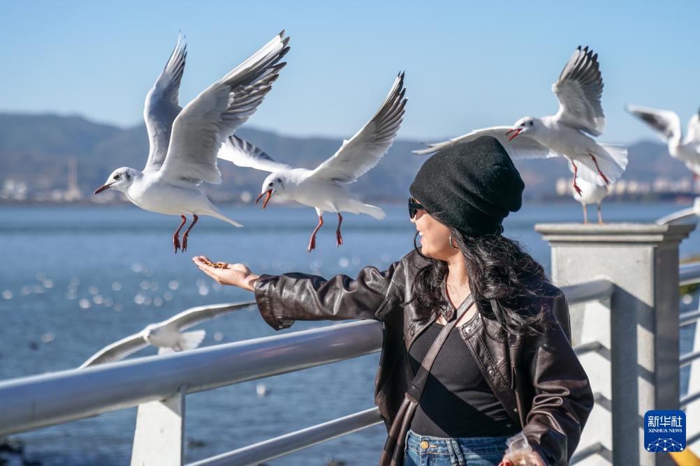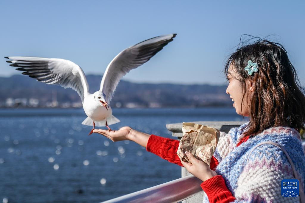 1月22日,游客在滇池畔喂红嘴鸥。新华社记者 彭奕凯 摄