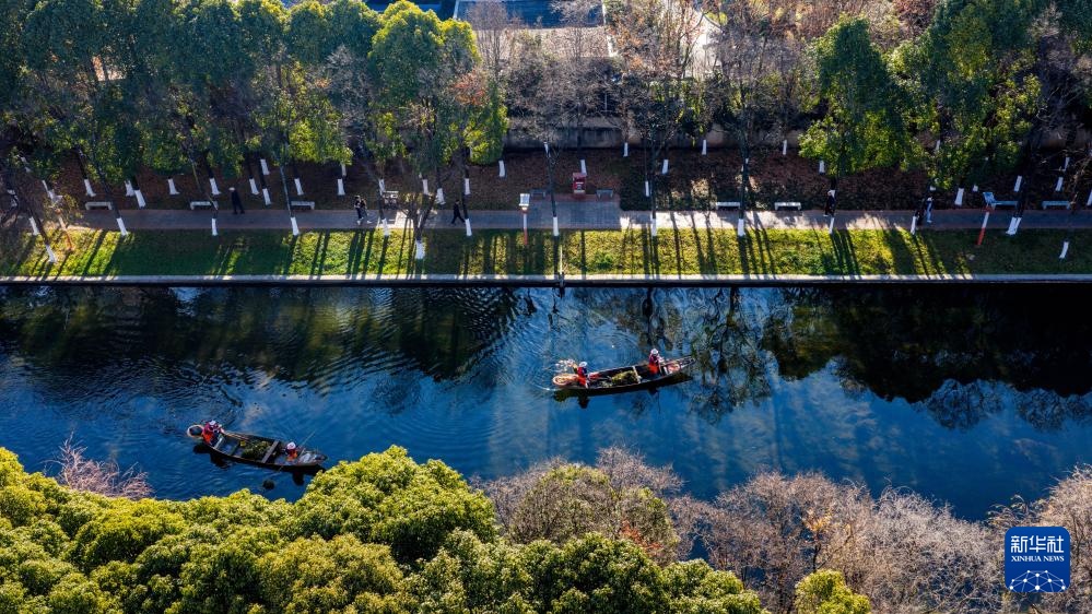 1月22日,工作人员在滇池入湖河道船房河进行打捞作业(无人机照片)。新华社记者 胡超 摄