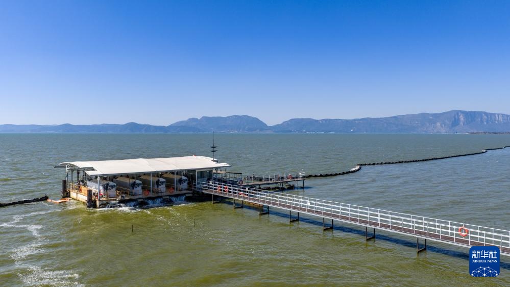 1月22日拍摄的滇池外海罗家营蓝藻收集处理站(无人机照片)。新华社记者 胡超 摄